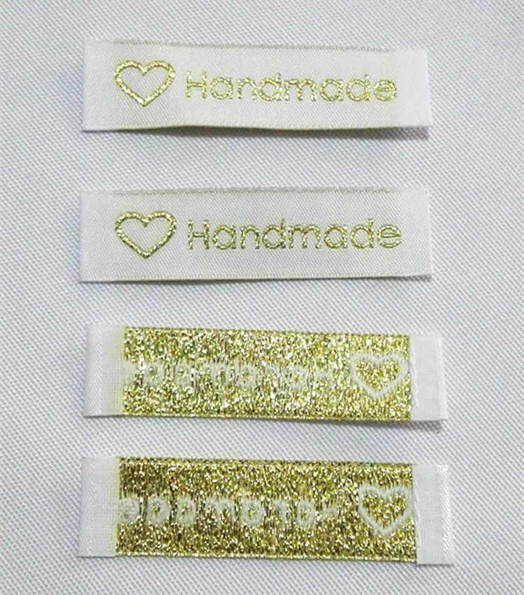 Tag, White, gold embroidered wording "HAND MADE " with heart symbol