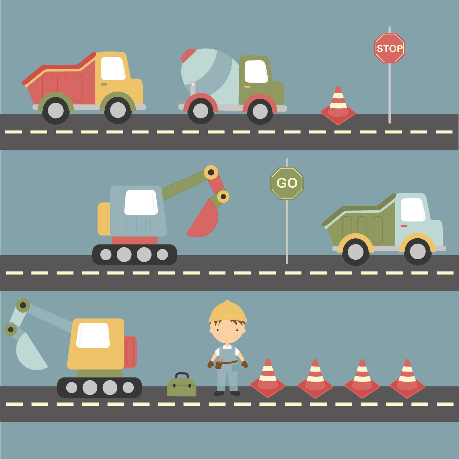 Road works Construction equipment, roads, signs, for use as a blanket or quilt front.