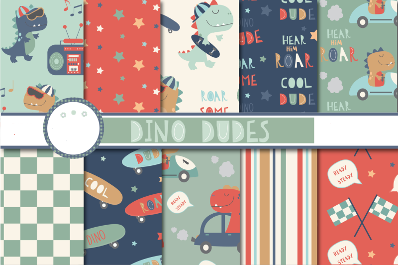 A modern design of Dinosaurs, skateboards, radios, cars, patterns for use as a blanket or quilt front.